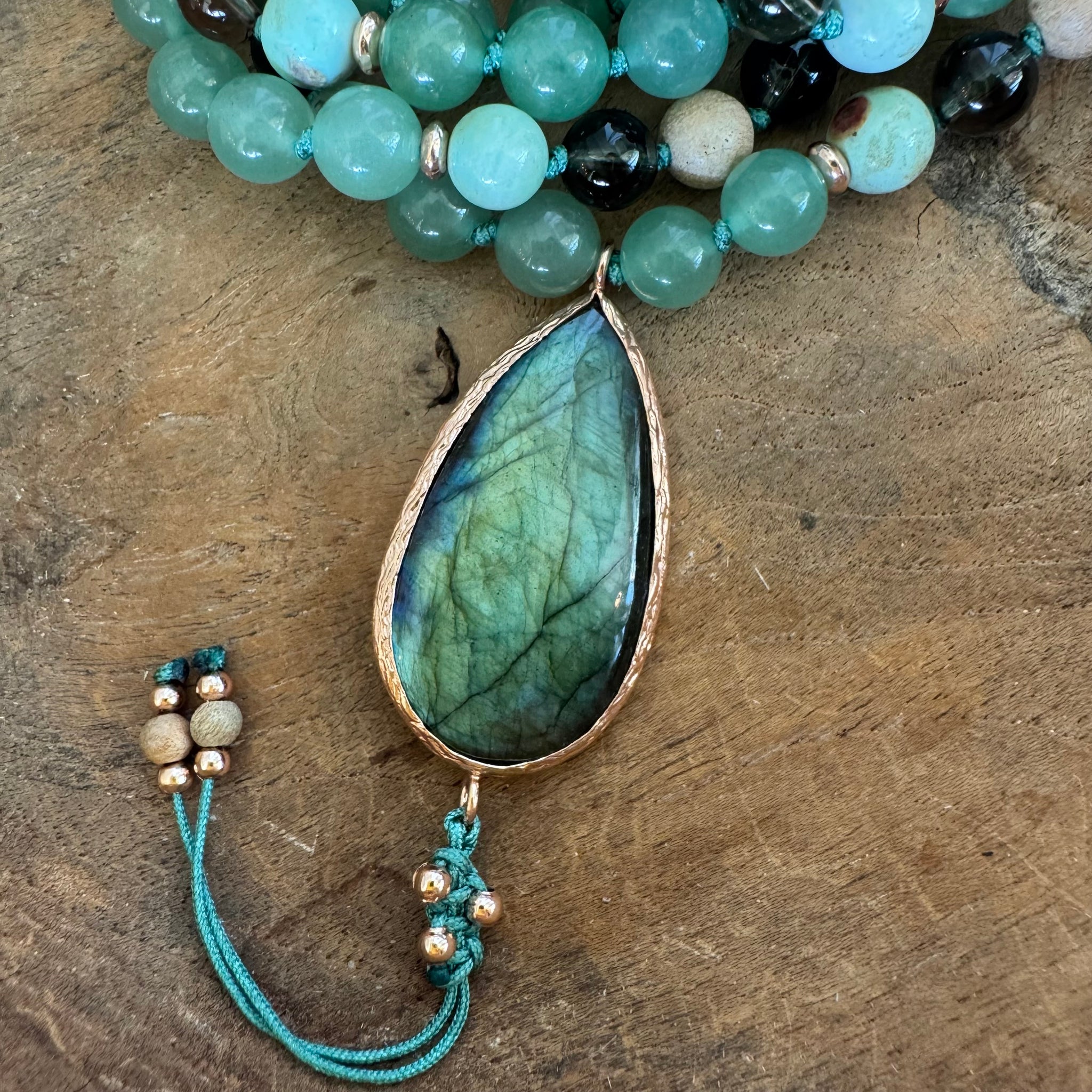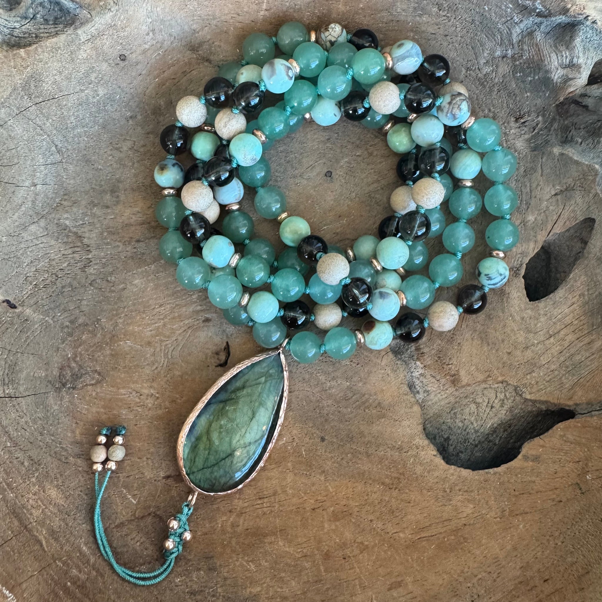 AgarWood, Smokey Quartz, Aventurine, Robin's Egg Agate Mala with Labradorite Guru Bead