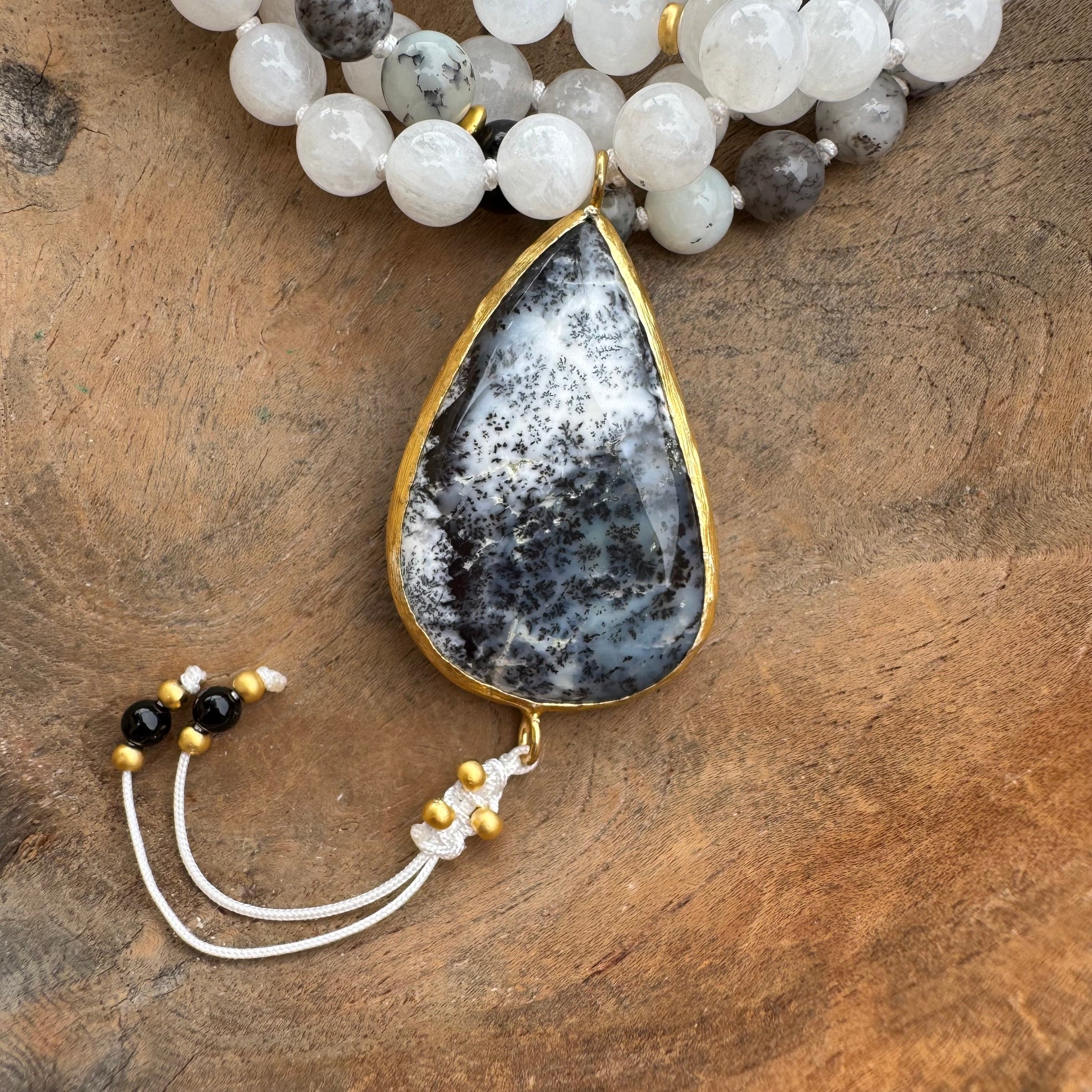 Merlinite, Moonstone and Black Tourmaline Mala with Merlinite Guru Bead